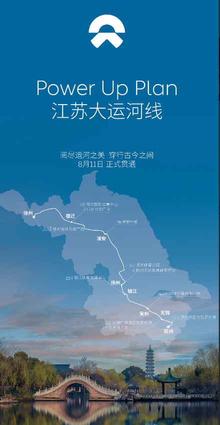 8月11日,蔚来官网发布,Power UP Plan江苏大运河线正式贯通,全程615Km,共有9座换电站,7座超充站,自苏州园林为起始点,中间途经无锡水浒城、常州天宁禅寺、镇江金山寺、扬州二十四桥、淮安天泉湖、宿迁项王故里、徐州汉文化景区,共覆盖8座城市。