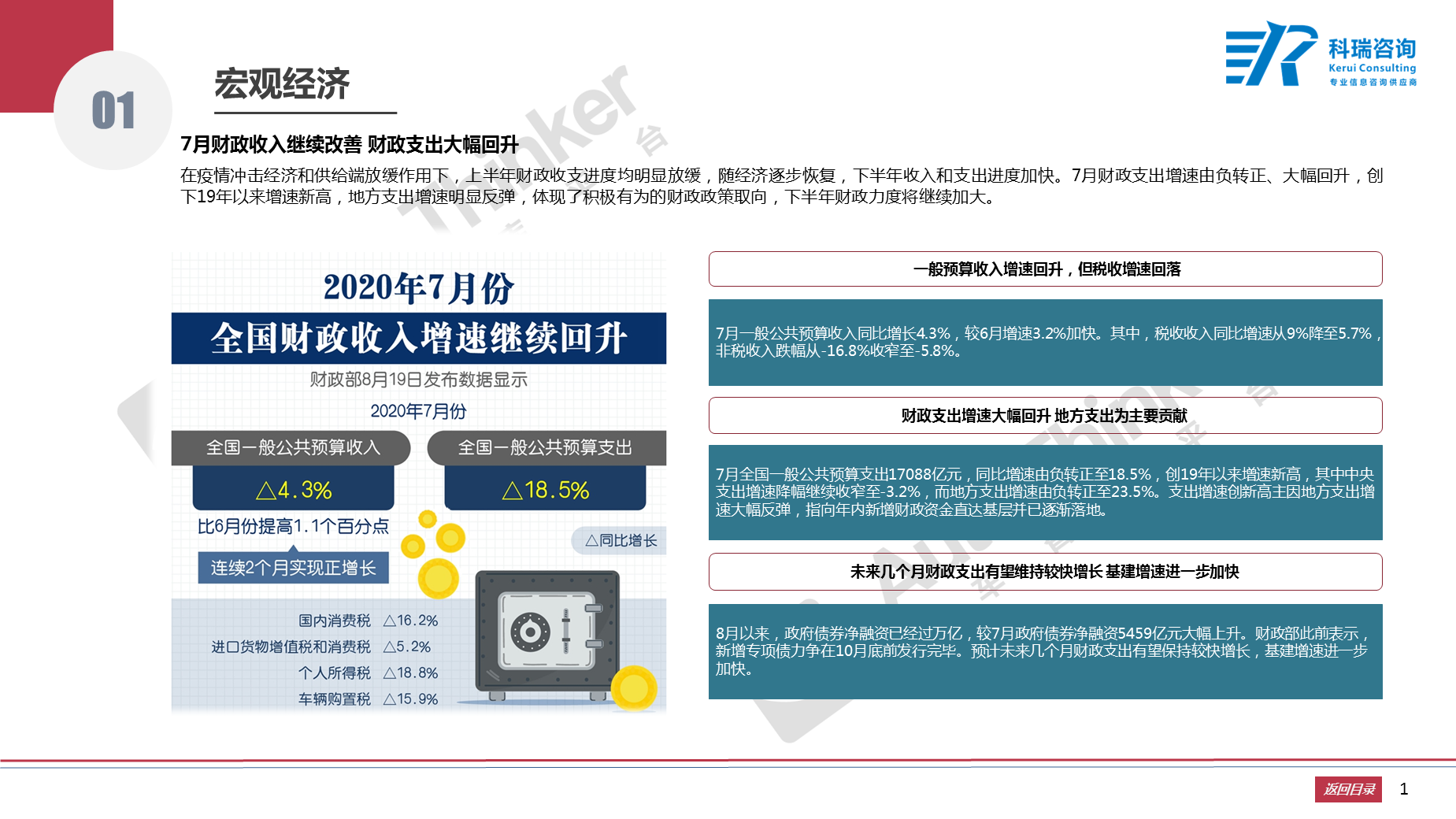 在疫情冲击经济和供给端放缓作用下,上半年财政收支进度均明显放缓,随经济逐步恢复,下半年收入和支出进度加快。7月财政支出增速由负转正、大幅回升,创下19年以来增速新高,地方支出增速明显反弹,体现了积极有为的财政政策取向,下半年财政力度将继续加大。