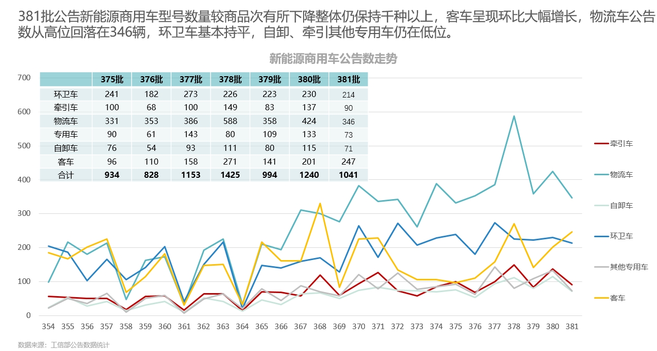381批公告新能源商用车型号数量较商品次有所下降整体仍保持千种以上,客车呈现环比大幅增长,物流车公告数从高位回落在346辆,环卫车基本持平,自卸、牵引其他专用车仍在低位。