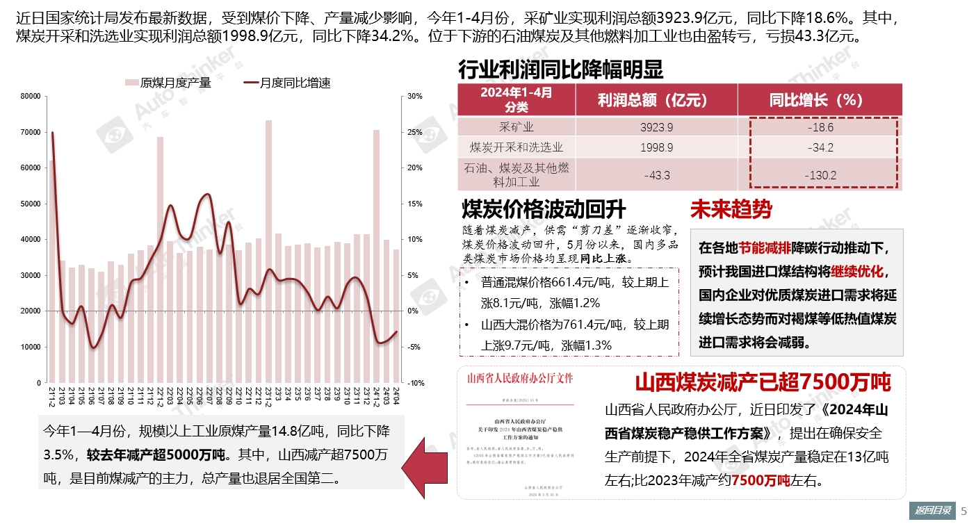 近日国家统计局发布最新数据,受到煤价下降、产量减少影响,今年1-4月份,采矿业实现利润总额3923.9亿元,同比下降18.6%。其中,煤炭开采和洗选业实现利润总额1998.9亿元,同比下降34.2%。位于下游的石油煤炭及其他燃料加工业也由盈转亏,亏损43.3亿元。