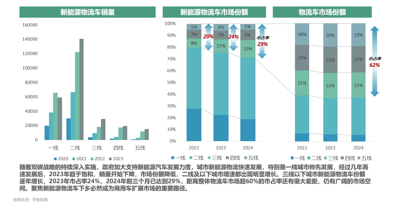 随着双碳战略的持续深入实施,政府加大支持新能源汽车发展力度,城市新能源物流快速发展,特别是一线城市帅先发展,经过几年高速发展后,2023年趋于饱和,销量开始下降,市场份额降低,二线及以下城市增速都出现明显增长。三线以下城市新能源物流车份额逐年增长,2023年市占率24%,2024年前三个月已达到29%,距离整体物流车市场超60%的市占率还有很大差距,仍有广阔的市场空间。聚焦新能源物流车下乡必然成为商用车扩展市场的重要路径。