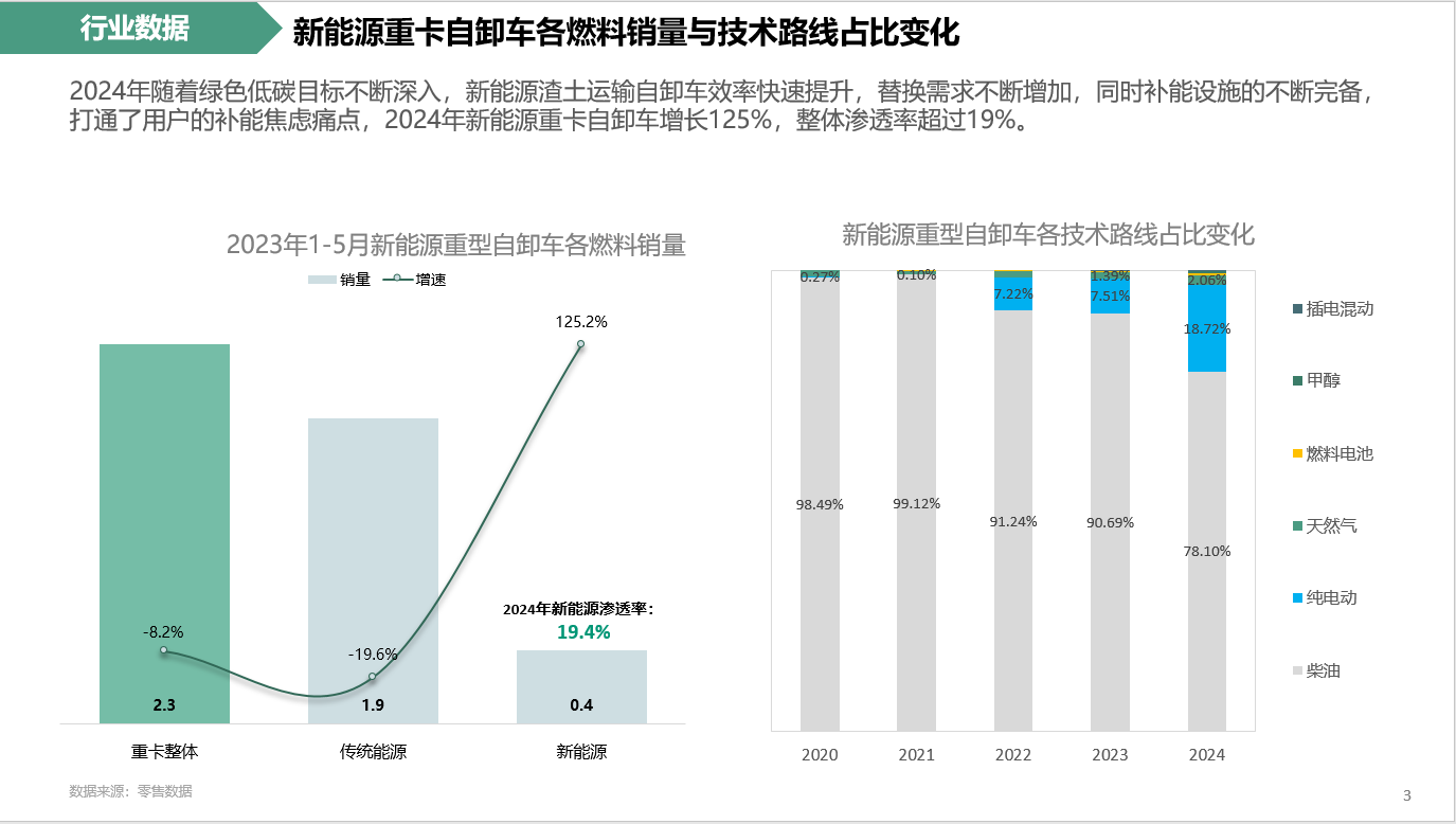 2024年随着绿色低碳目标不断深入,新能源渣土运输自卸车效率快速提升,替换需求不断增加,同时补能设施的不断完备,打通了用户的补能焦虑痛点,2024年新能源重卡自卸车增长125%,整体渗透率超过19%。