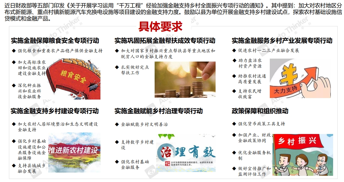 近日财政部等五部门印发《关于开展学习运用“千万工程”经验加强金融支持乡村全面振兴专项行动的通知》。其中 提到:加大对农村地区分布式新能源、重点村镇新能源汽车充换电设施等项目建设的金融支持力度。鼓励以县为单位开 展金融支持乡村建设试点,探索农村基础设施信贷模式和金融产品。