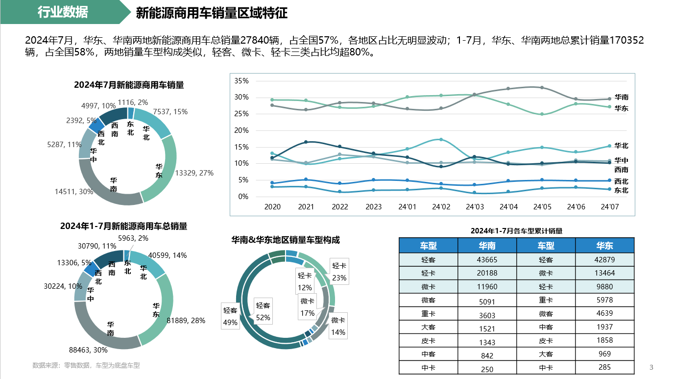 2024年7月,华东、华南两地新能源商用车总销量27840辆,占全国57%,各地区占比无明显波动;1-7月,华东、华南两地总累计销量170352辆,占全国58%,两地销量车型构成类似,轻客、微卡、轻卡三类占比均超80%。