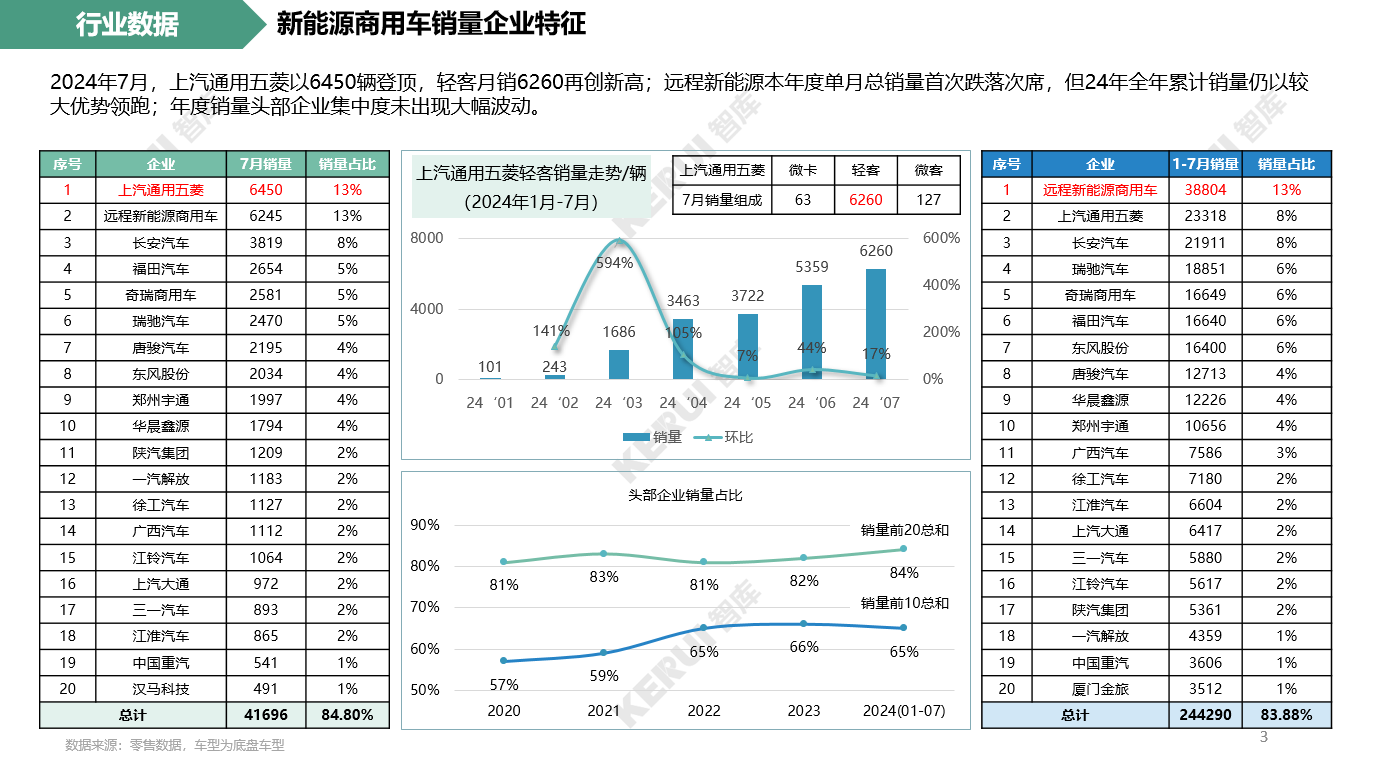 2024年7月,上汽通用五菱以6450辆登顶,轻客月销6260再创新高;远程新能源本年度单月总销量首次跌落次席,但24年全年累计销量仍以较大优势领跑;年度销量头部企业集中度未出现大幅波动。