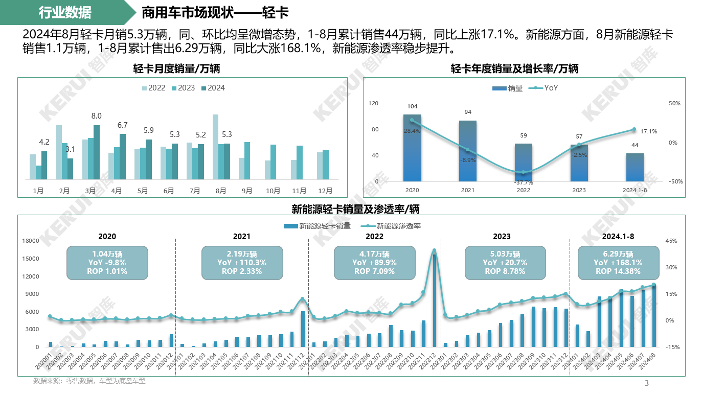 2024年8月轻卡月销5.3万辆,同、环比均呈微增态势,1-8月累计销售44万辆,同比上涨17.1%。新能源方面,8月新能源轻卡销售1.1万辆,1-8月累计售出6.29万辆,同比大涨168.1%,新能源渗透率稳步提升。