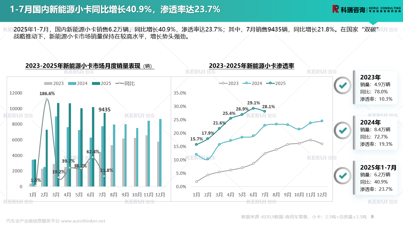 2025年1-7月,国内新能源小卡销售6.2万辆,同比增长40.9%,渗透率达23.7%;其中,7月销售9435辆,同比增长21.8%。在国家“双碳”战略推动下,新能源小卡市场销量保持在较高水平,增长势头强劲。