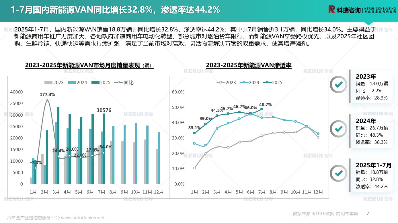 2025年1-7月,国内新能源VAN销售18.8万辆,同比增长32.8%,渗透率达44.2%;其中,7月销售近3.1万辆,同比增长34.0%。主要得益于新能源商用车推广力度加大,各地政府加速商用车电动化转型,部分城市对燃油货车限行,而新能源VAN享受路权优先,以及2025年社区团购、生鲜冷链、快递快运等需求持续扩张,满足了当前市场对高效、灵活物流解决方案的双重需求,使其增速强劲。