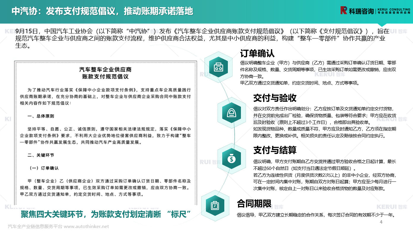 9月15日,中国汽车工业协会(以下简称“中汽协”)发布《汽车整车企业供应商账款支付规范倡议》(以下简称《支付规范倡议》),旨在规范汽车整车企业与供应商之间的账款支付流程,维护供应商合法权益,尤其是中小供应商的利益,构建“整车—零部件”协作共赢的产业生态。