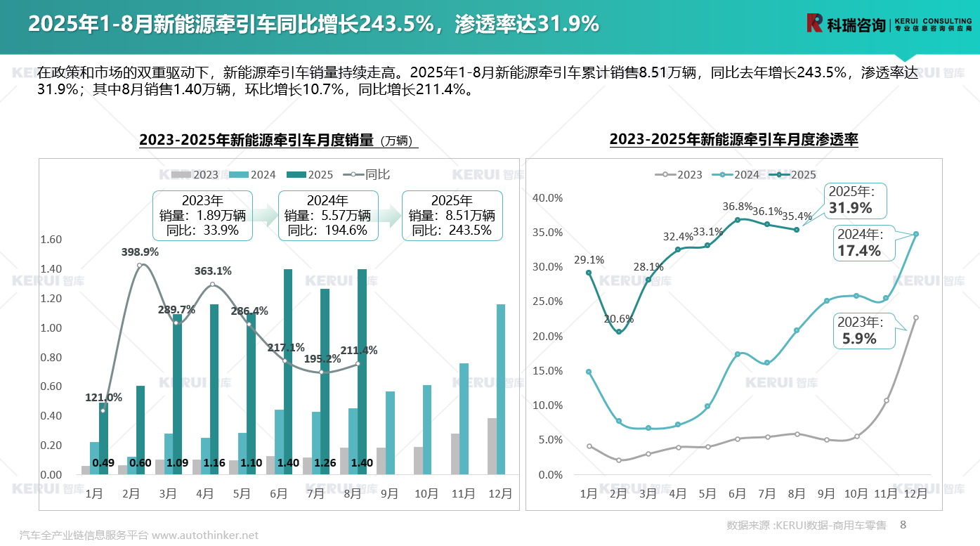 在政策和市场的双重驱动下,新能源牵引车销量持续走高。2025年1-8月新能源牵引车累计销售8.51万辆,同比去年增长243.5%,渗透率达31.9%;其中8月销售1.40万辆,环比增长10.7%,同比增长211.4%。