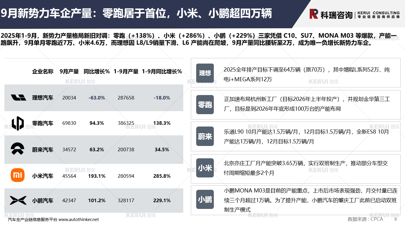 2025年1-9月,新势力产量格局新旧对调:零跑(+138%)、小米(+286%)、小鹏(+229%)三家凭借 C10、SU7、MONA M03 等爆款,产能一路飙升,9月单月零跑近7万、小米4.6万,而理想因 L8/L9销量下滑、L6 产能尚在爬坡,9月产量同比腰斩至2万,成为唯一负增长新势力车企。