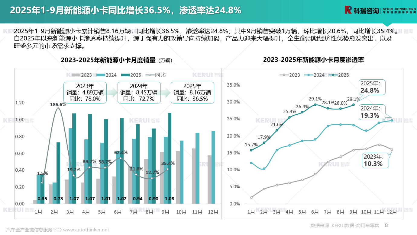 2025年1-9月新能源小卡累计销售8.16万辆,同比增长36.5%,渗透率达24.8%;其中9月销售突破1万辆,环比增长20.6%,同比增长35.4%。自2025年以来新能源小卡渗透率持续提升,源于强有力的政策导向持续加码,产品力迎来大幅提升,全生命周期经济性优势愈发突出,以及旺盛多元的市场需求支撑。