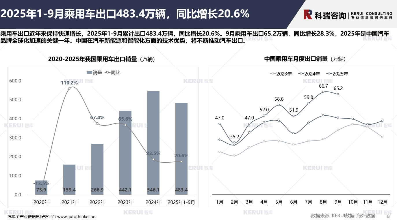 乘用车出口近年来保持快速增长,2025年1-9月累计出口483.4万辆,同比增长20.6%。9月乘用车出口65.2万辆,同比增长28.3%。2025年是中国汽车品牌全球化加速的关键一年。中国在汽车新能源和智能化方面的技术优势,将不断推动汽车出口。