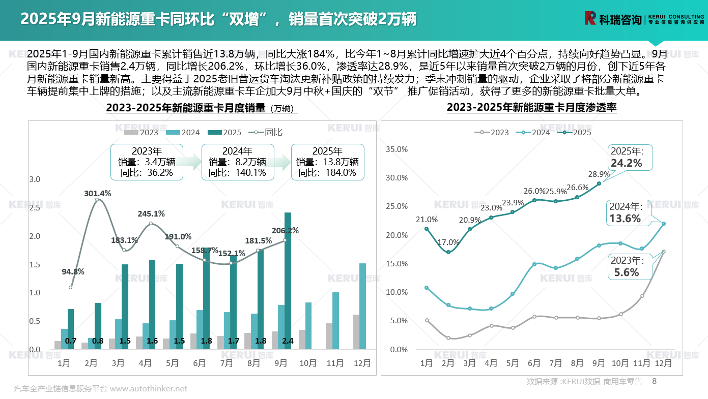 2025年1-9月国内新能源重卡累计销售近13.8万辆,同比大涨184%,比今年1~8月累计同比增速扩大近4个百分点,持续向好趋势凸显。9月国内新能源重卡销售2.4万辆,同比增长206.2%,环比增长36.0%,渗透率达28.9%,是近5年以来销量首次突破2万辆的月份,创下近5年各月新能源重卡销量新高。主要得益于2025老旧营运货车淘汰更新补贴政策的持续发力;季末冲刺销量的驱动,企业采取了将部分新能源重卡车辆提前集中上牌的措施;以及主流新能源重卡车企加大9月中秋+国庆的“双节” 推广促销活动,获得了更多的新能源重卡批量大单。