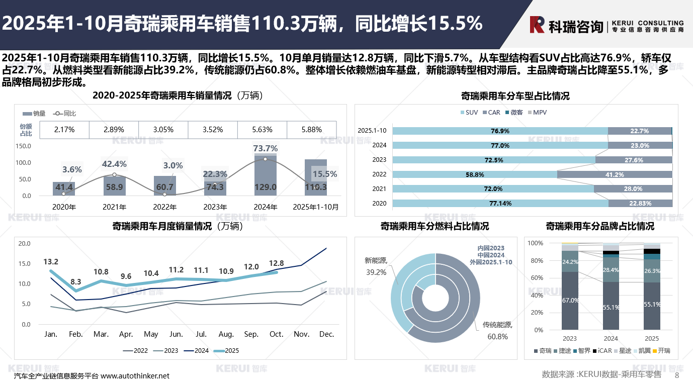 2025年1-10月奇瑞乘用车销售110.3万辆,同比增长15.5%。10月单月销量达12.8万辆,同比下滑5.7%。从车型结构看SUV占比高达76.9%,轿车仅占22.7%。从燃料类型看新能源占比39.2%,传统能源仍占60.8%。整体增长依赖燃油车基盘,新能源转型相对滞后。主品牌奇瑞占比降至55.1%,多品牌格局初步形成。