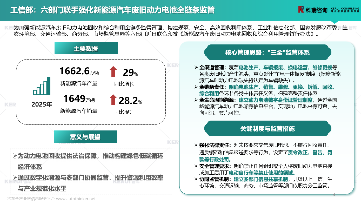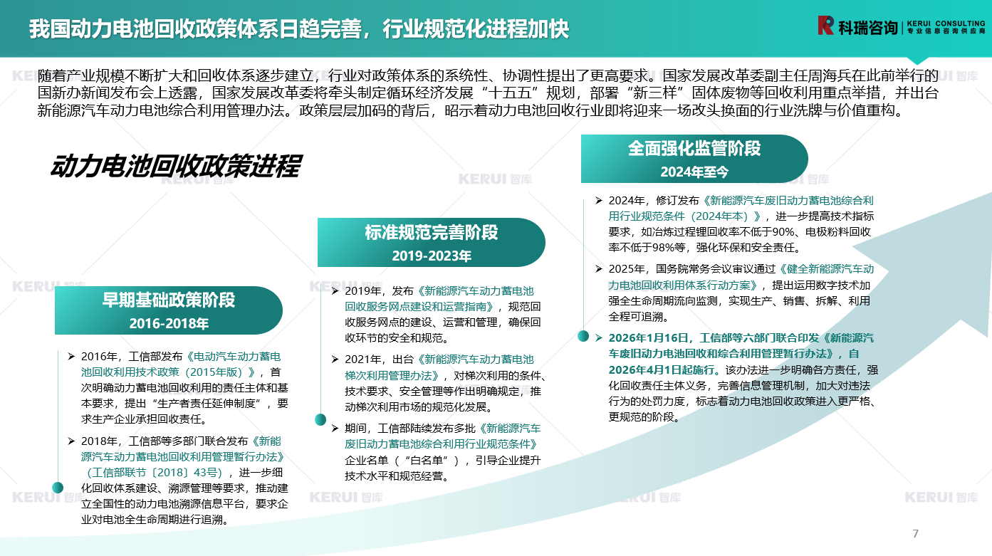 随着产业规模不断扩大和回收体系逐步建立,行业对政策体系的系统性、协调性提出了更高要求。国家发展改革委副主任周海兵在此前举行的国新办新闻发布会上透露,国家发展改革委将牵头制定循环经济发展“十五五”规划,部署“新三样”固体废物等回收利用重点举措,并出台新能源汽车动力电池综合利用管理办法。政策层层加码的背后,昭示着动力电池回收行业即将迎来一场改头换面的行业洗牌与价值重构。