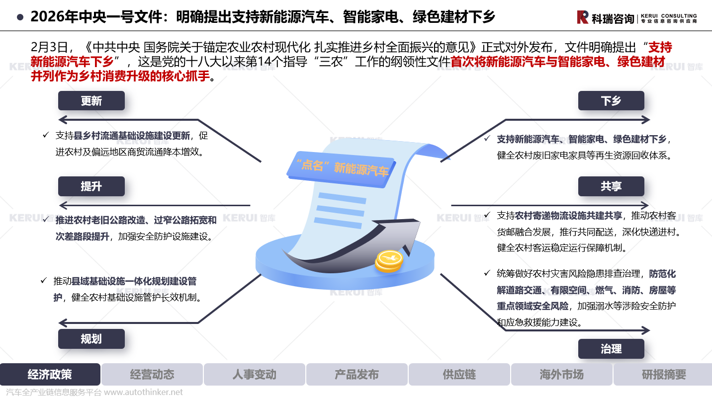 2月3日,《中共中央 国务院关于锚定农业农村现代化 扎实推进乡村全面振兴的意见》正式对外发布,文件明确提出“支持新能源汽车下乡”,这是党的十八大以来第14个指导“三农”工作的纲领性文件首次将新能源汽车与智能家电、绿色建材并列作为乡村消费升级的核心抓手。