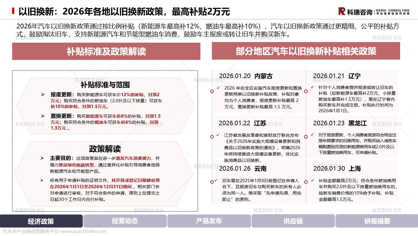 2026年汽车以旧换新政策通过按比例补贴(新能源车最高补12%、燃油车最高补10%),汽车以旧换新政策通过更精细、公平的补贴方式,鼓励淘汰旧车,支持新能源汽车和节能型燃油车消费,鼓励车主报废或转让旧车并购买新车。