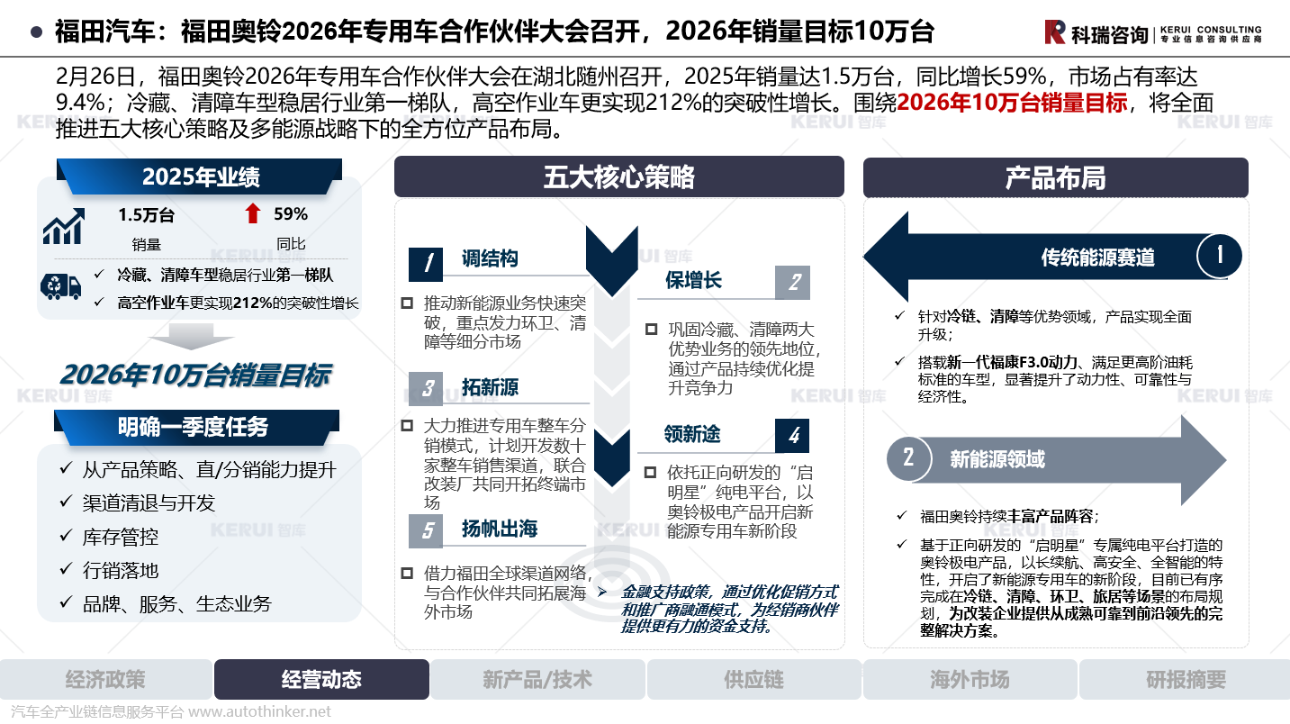 2月26日,福田奥铃2026年专用车合作伙伴大会在湖北随州召开,2025年销量达1.5万台,同比增长59%,市场占有率达9.4%;冷藏、清障车型稳居行业第一梯队,高空作业车更实现212%的突破性增长。围绕2026年10万台销量目标,将全面推进五大核心策略及多能源战略下的全方位产品布局。