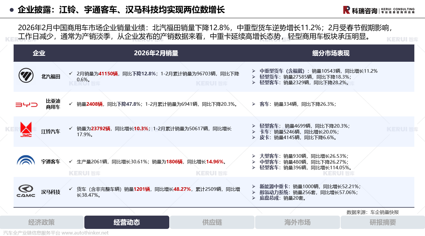 2026年2月中国商用车市场企业销量业绩:北汽福田销量下降12.8%,中重型货车逆势增长11.2%;2月受春节假期影响,工作日减少,通常为产销淡季,从企业发布的产销数据来看,中重卡延续高增长态势,轻型商用车板块承压明显。