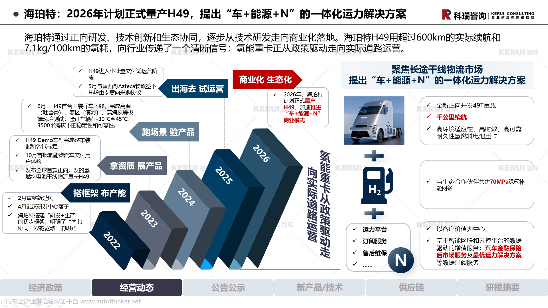 海珀特通过正向研发、技术创新和生态协同,逐步从技术研发走向商业化落地。海珀特H49用超过600km的实际续航和7.1kg/100km的氢耗,向行业传递了一个清晰信号:氢能重卡正从政策驱动走向实际道路运营。