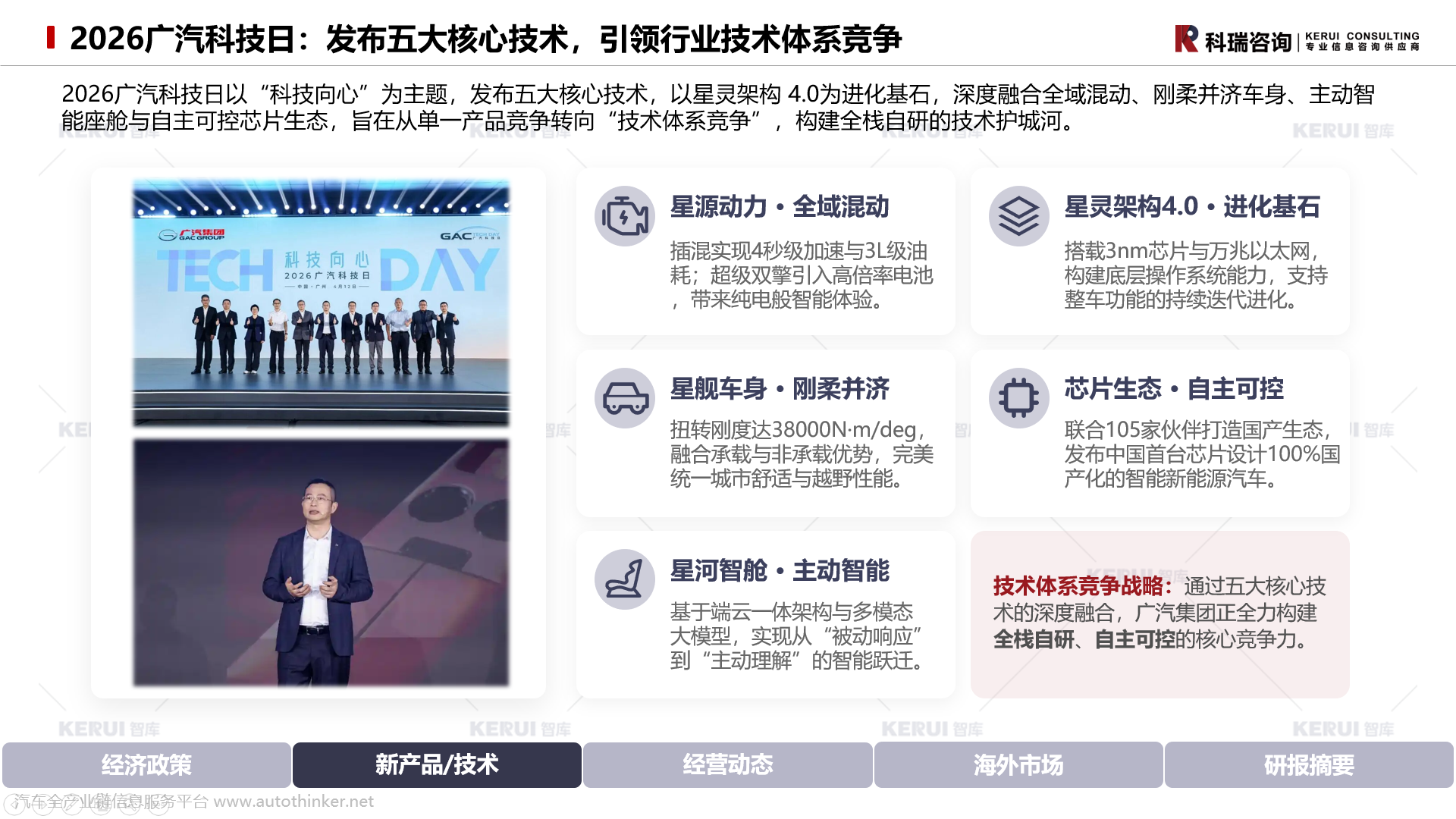 2026广汽科技日以“科技向心”为主题,发布五大核心技术,以星灵架构 4.0为进化基石,深度融合全域混动、刚柔并济车身、主动智能座舱与自主可控芯片生态,旨在从单一产品竞争转向“技术体系竞争”,构建全栈自研的技术护城河。