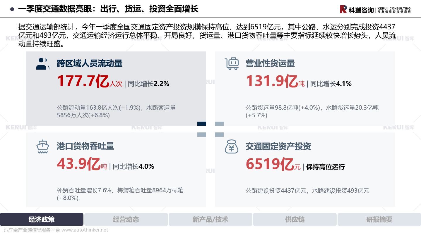 据交通运输部统计,今年一季度全国交通固定资产投资规模保持高位、达到6519亿元,其中公路、水运分别完成投资4437亿元和493亿元,交通运输经济运行总体平稳、开局良好,货运量、港口货物吞吐量等主要指标延续较快增长势头,人员流动量持续旺盛。