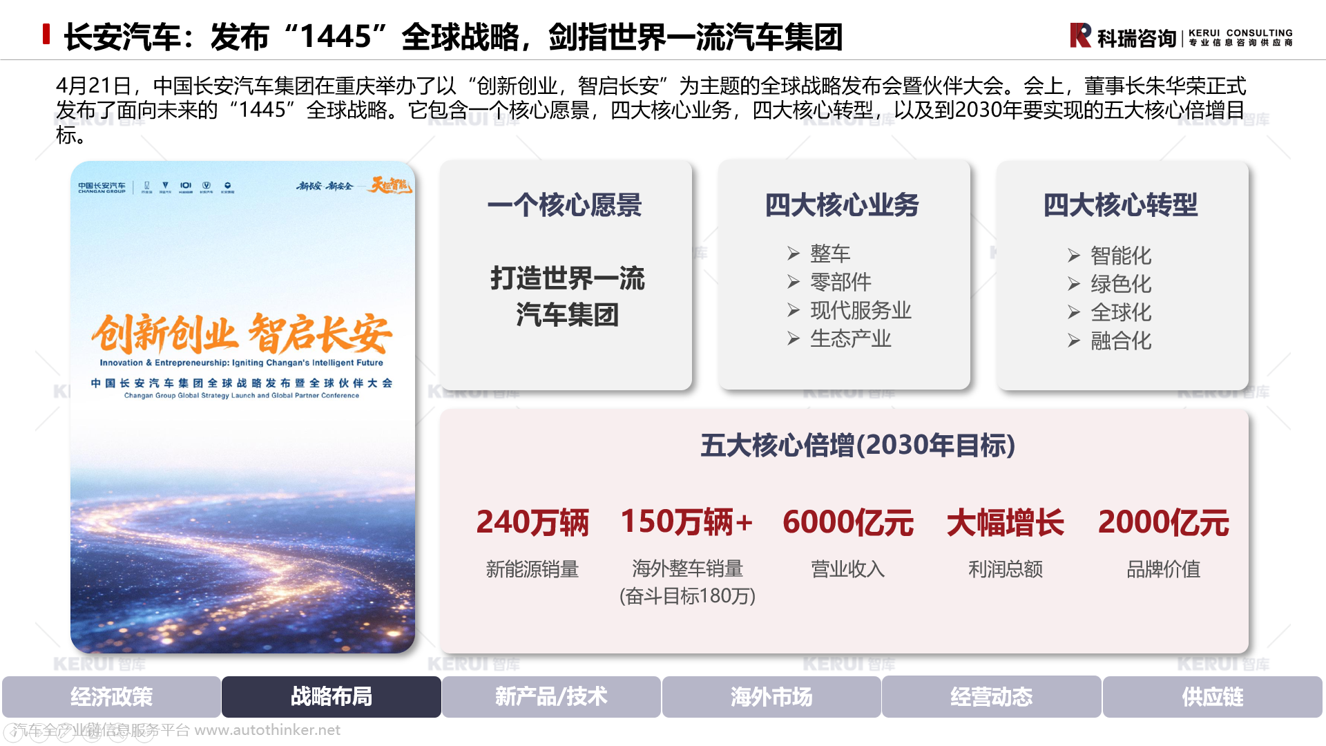 4月21日,中国长安汽车集团在重庆举办了以“创新创业,智启长安”为主题的全球战略发布会暨伙伴大会。会上,董事长朱华荣正式发布了面向未来的“1445”全球战略。它包含一个核心愿景,四大核心业务,四大核心转型,以及到2030年要实现的五大核心倍增目标。