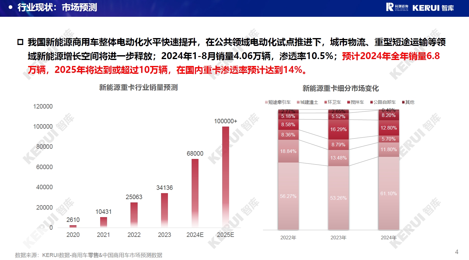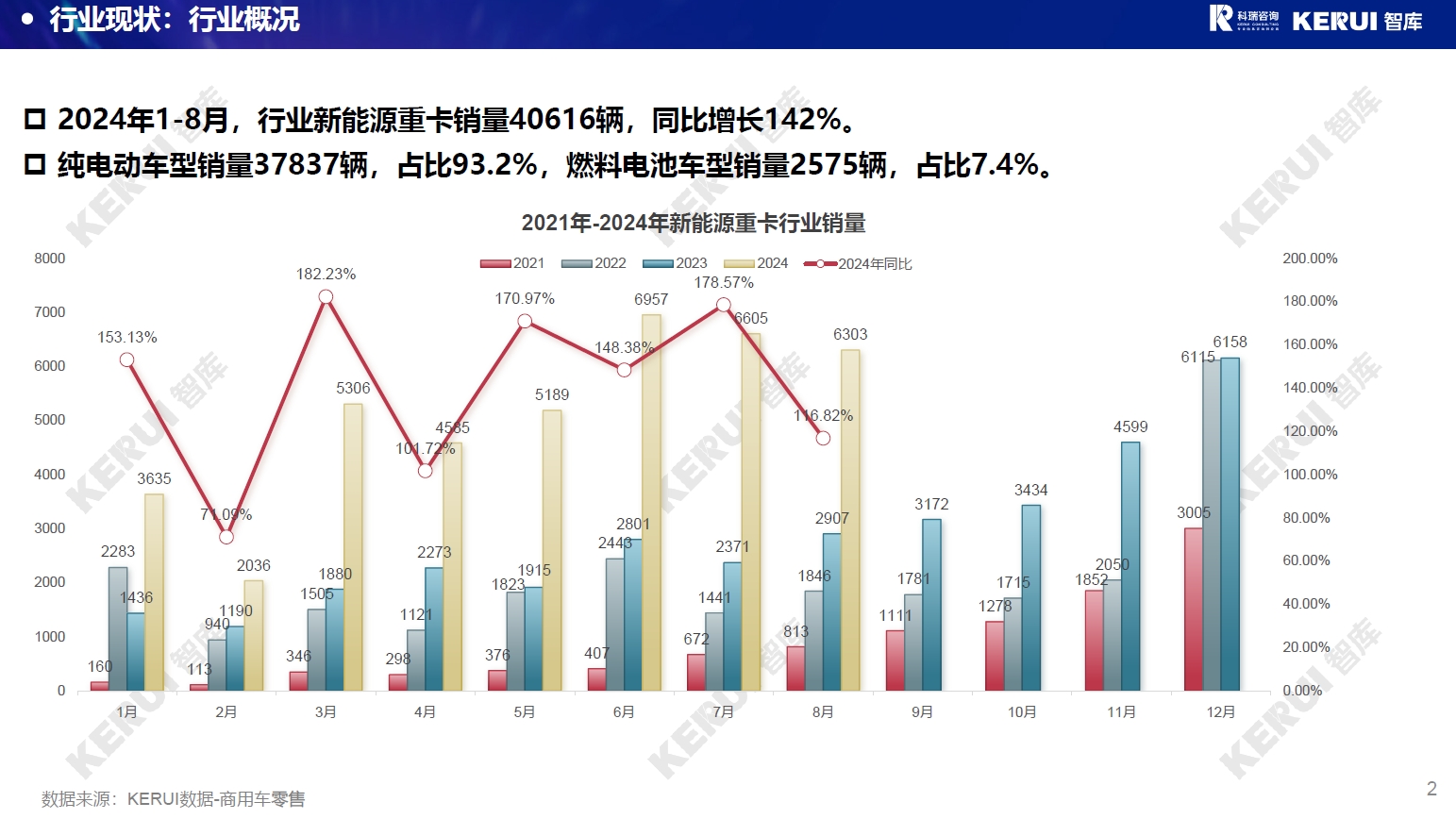 2024 年1-8月,行业新能源重卡销量40616辆,同比增长142%。纯电动车型销量 37837辆,占比93.2%,燃料电池车型销量2575辆,占比7.4%。展开