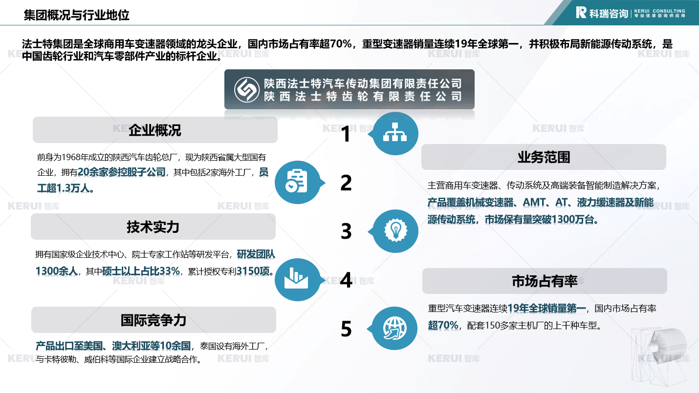 法士特集团是全球商用车变速器领域的龙头企业,国内市场占有率超70%,重型变速器销量连续19年全球第一,并积极布局新能源传动系统,是中国齿轮行业和汽车零部件产业的标杆企业。展开