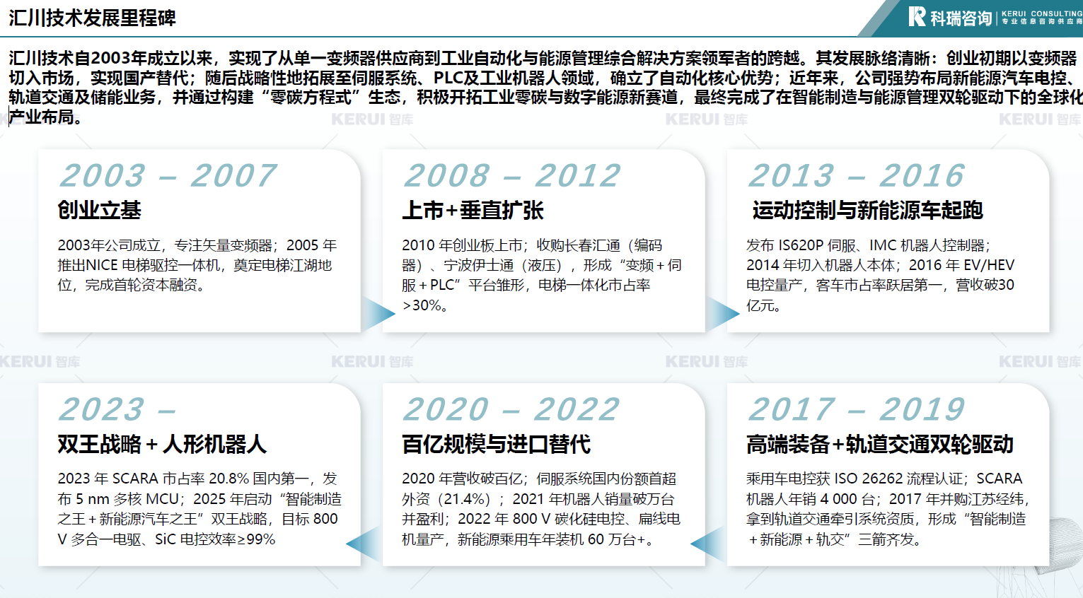 企业专题汇川技术自2003年成立以来,实现了从单一变频器供应商到工业自动化与能源管理综合解决方案领军者的跨越。其发展脉络清晰:创业初期以变频器切入市场,实现国产替代;随后战略性地拓展至伺服系统、PLC及工业机器人领域,确立了自动化核心优势;近年来,公司强势布局新能源汽车电控、轨道交通及储能业务,并通过构建“零碳方程式”生态,积极开拓工业零碳与数字能源新赛道,最终完成了在智能制造与能源管理双轮驱动下的全球化产业布局。