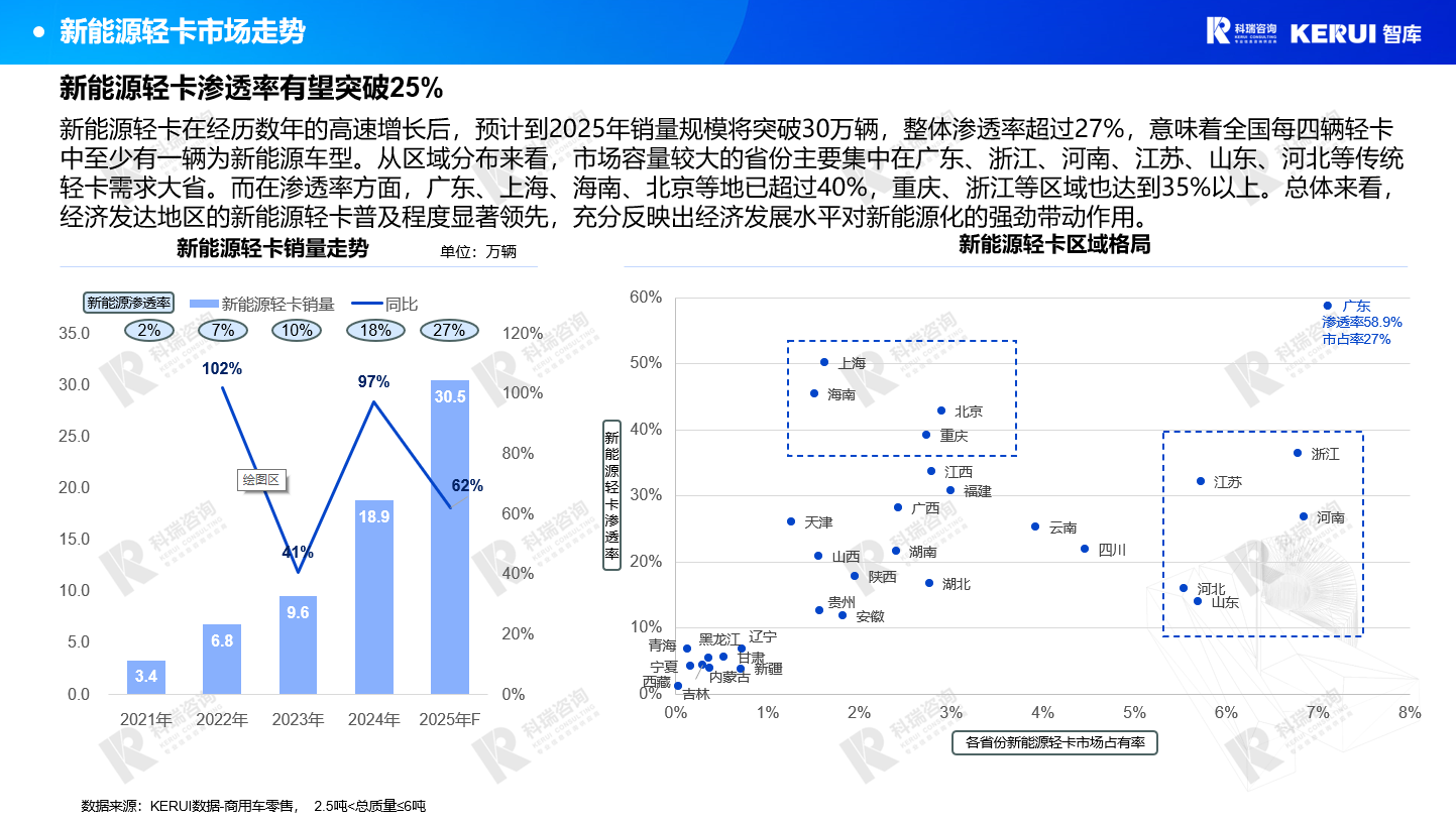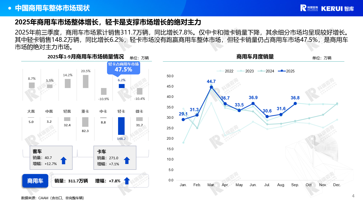 2025年前三季度,商用车市场累计销售311.7万辆,同比增长7.8%。仅中卡和微卡销量下降,其余细分市场均呈现较好增长。 其中轻卡销售148.2万辆,同比增长6.2%,轻卡市场没有跑赢商用车整体市场,但轻卡销量仍占商用车市场47.5%,是商用车市场的绝对主力市场。展开
