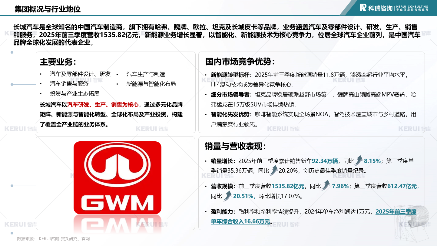 长城汽车是全球知名的中国汽车制造商,旗下拥有哈弗、魏牌、欧拉、坦克及长城皮卡等品牌,业务涵盖汽车及零部件设计、研发、生产、销售和服务,2025年前三季度营收1535.82亿元,新能源业务增长显著,以智能化、新能源技术为核心竞争力,位居全球汽车企业前列,是中国汽车品牌全球化发展的代表企业。展开
