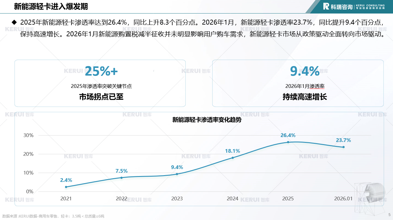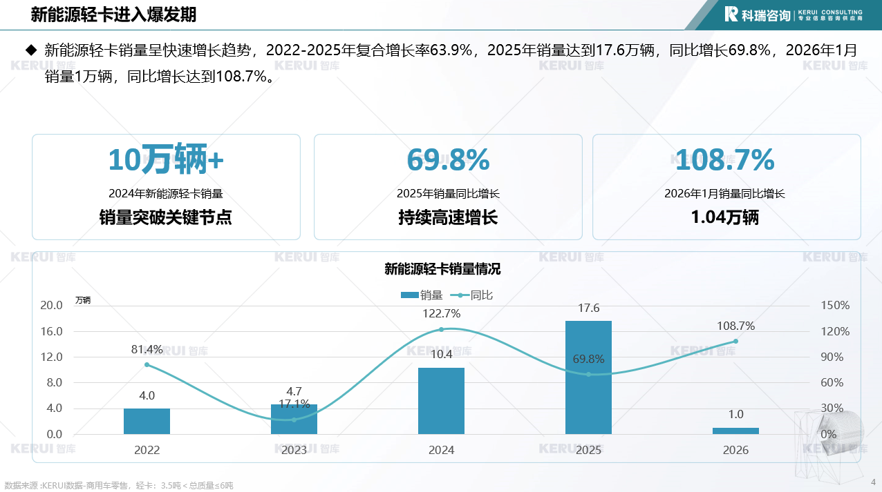 新能源轻卡销量呈快速增长趋势,2022-2025年复合增长率63.9%,2025年销量达到17.6万辆,同比增长69.8%,2026年1月销量1万辆,同比增长达到108.7%。展开