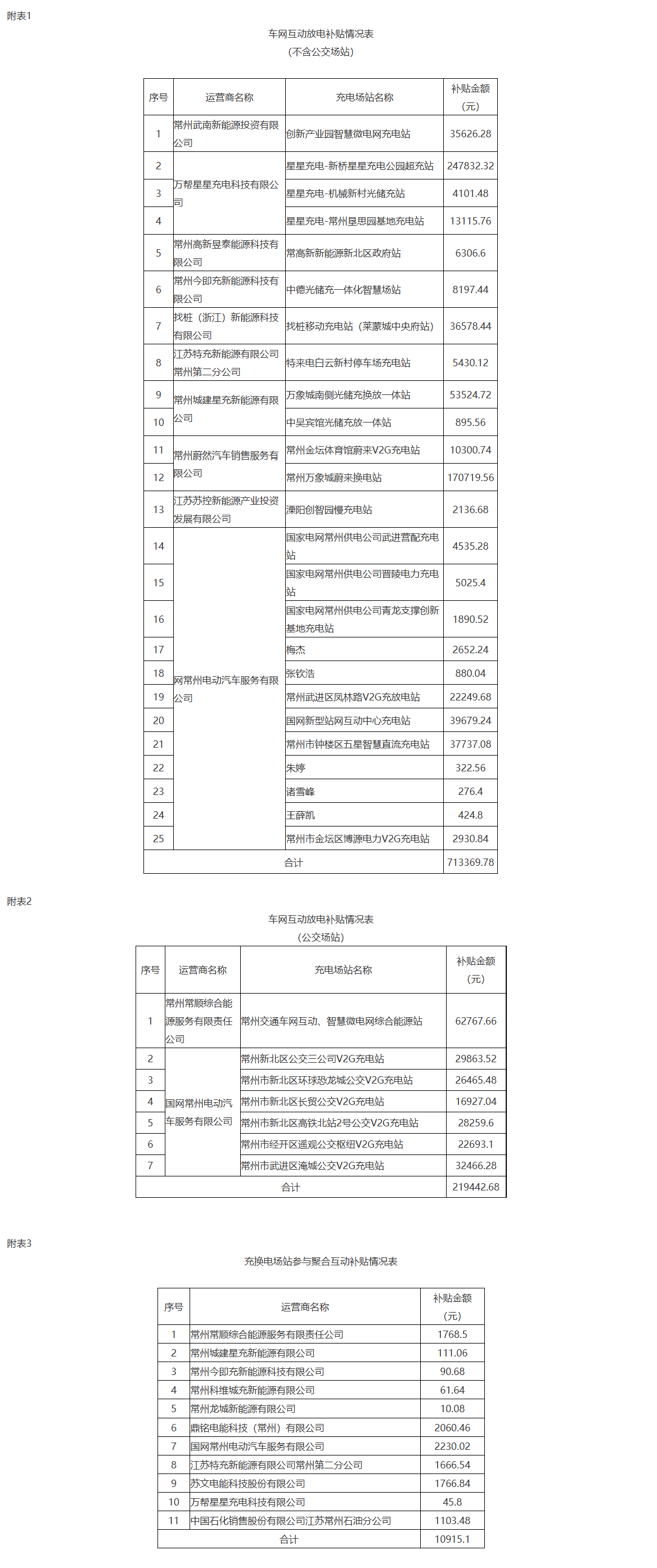 一、本次资金的发放对象为参与2025年8月28日—30日、9月8日—14日、9月22日—28日、11月10日—11月23日放电的公共、专用充电场,双向换电站,社区V2G桩运营商和参与8月28日聚合互动的公共和专用充换电场站运营商,公交场站的放电补贴对象为常州市公共交通集团有限责任公司。本次兑付资金总金额为943727.56元,其中:参与放电的各充换电场站(公交场站除外)补贴资金713369.78元,参与聚合互动资金10915.1元,由市级财政直达兑付至常州新能源集团有限公司;公交场站放电补贴资金219442.68元,由市级财政与常州市公共交通集团有限责任公司另行结算。