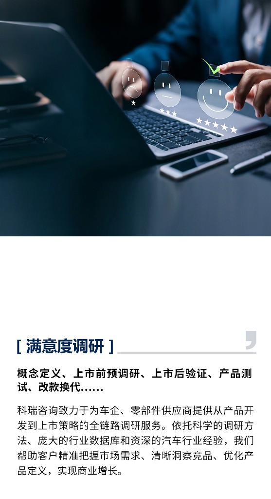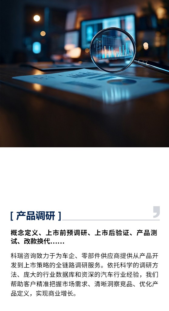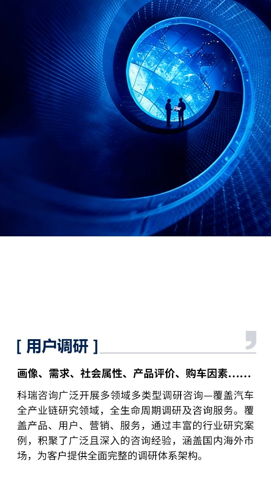 科瑞咨询广泛开展多领域多类型调研咨询,覆盖汽车全产业链研究领域与全生命周期调研及咨询服务。覆盖产品、用户、营销、服务,通过丰富的行业研究案例,积聚了广泛且深入的咨询经验,涵盖国内海外市场,为客户提供全面完整的调研体系架构。