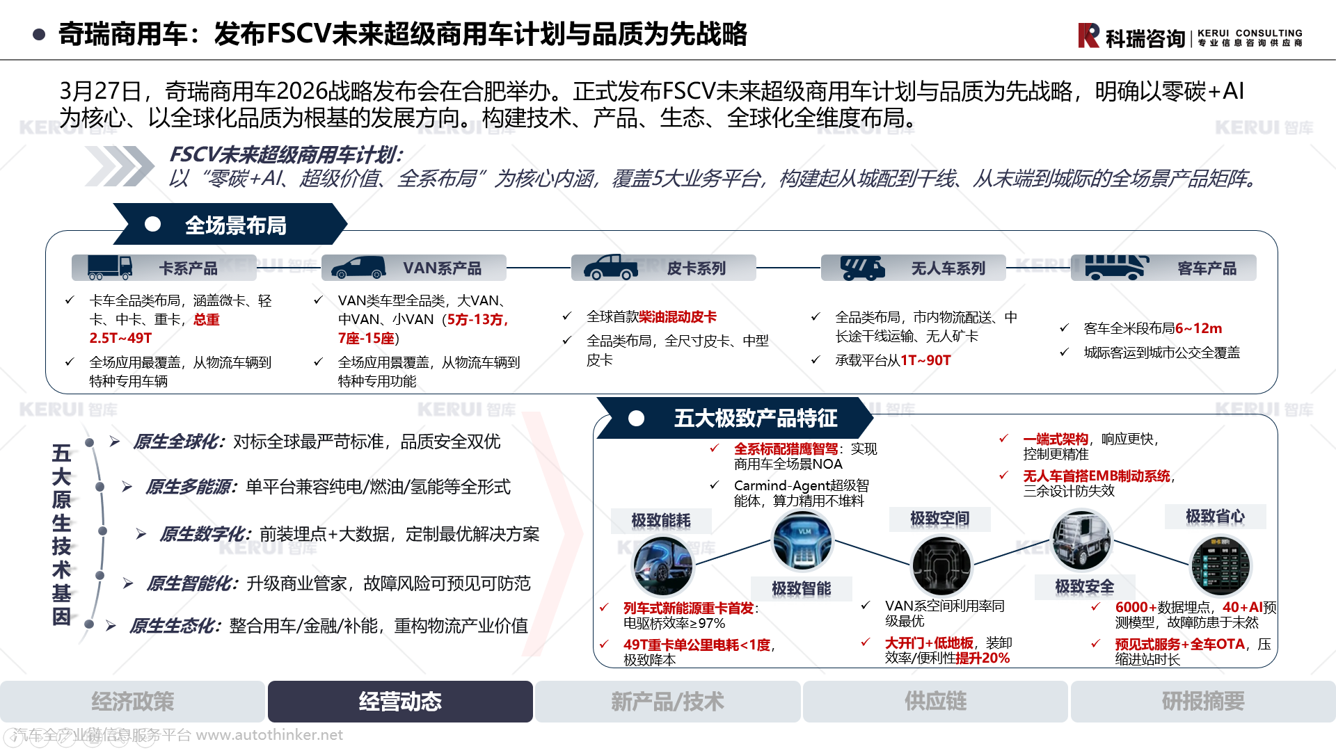 3月27日,奇瑞商用车2026战略发布会在合肥举办。正式发布FSCV未来超级商用车计划与品质为先战略,明确以零碳+AI为核心、以全球化品质为根基的发展方向。构建技术、产品、生态、全球化全维度布局。
