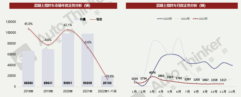 2022年11月,混凝土搅拌车市场销售1117辆,同比下降44%;2022年1-11月,混凝土搅拌车市场累计销售20158辆,同比下降78.8%。