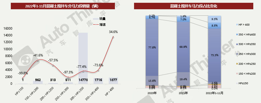 2022年1-11月,马力结构方面主要集中在300<HP≤350马力段,累计销售14778辆,同比下降77.4%,占据市场73.3%的份额,增长4.4个百分点。