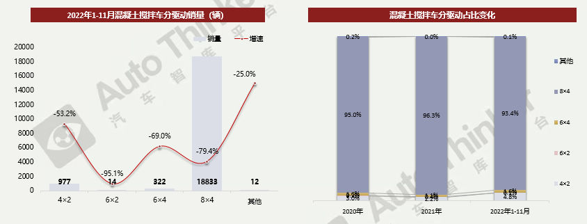 2022年1-11月,驱动形式方面主要集中在8×4驱动,累计销售18833辆,同比下降79.4%,占据市场93.4%的份额,下降2.9个百分点。