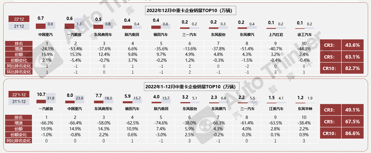 2022年12月,中重卡市场中国重汽、一汽解放、东风商用车销量占据前三名,其中中国重汽销量达到0.7万辆,同比下降24.1%;
