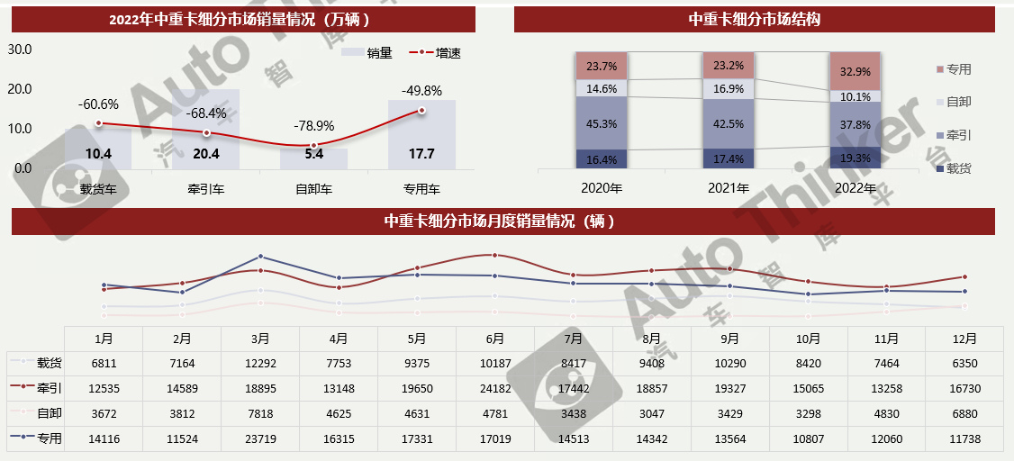 2022年12月,牵引车销量占据第一位,销量达到1.7万辆,同比下降37.6%;
