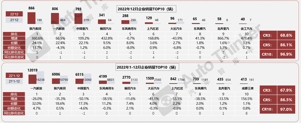 2022年12月,中重卡天然气市场陕汽集团、一汽解放、中国重汽销量占据前三名,其中陕汽集团销量达到866辆,同比增长360.6%;