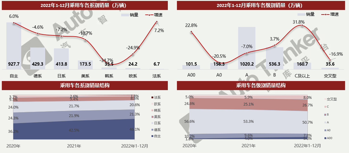 2022年1-12月,自主企业销售927.7万辆,同比增长6%;德系销售429.3万辆,同比下降4.6%;日系销售413.8万辆,同比下降7.2%;
