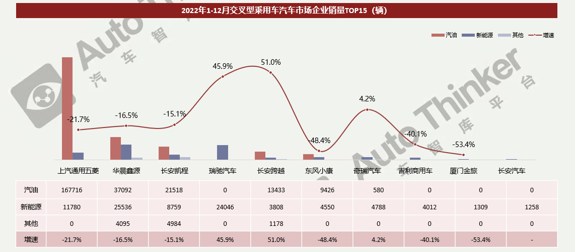 2022年1-12月,上汽通用五菱(汽油:167716辆,新能源:11780辆),同比下降21.7%;华晨鑫源(汽油:37092辆,新能源:25536辆),同比下降16.5%;长安凯程(汽油:21518辆,新能源:8759辆),同比下降15.1%。