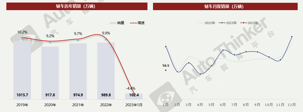 2023年1月轿车销量56.5万辆,同比下降44.8%。