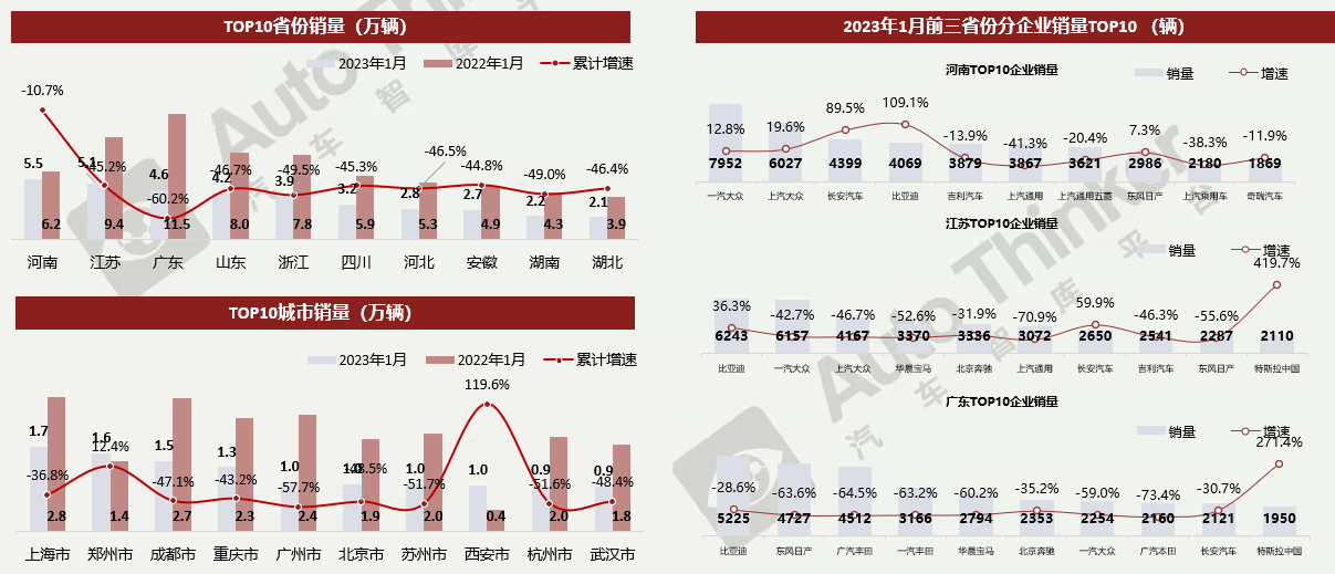 2023年1月,河南销售5.5万辆,同比下降10.7%;江苏销售5.1万辆,同比下降45.2%;广东销售4.6万辆,同比下降60.2%。