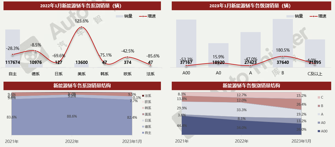 2023年1月,自主企业销售11.8万辆,同比下降28.3%;德系销售1.1万辆,同比下降8.5%;日系销售0万辆,同比下降69.6%;