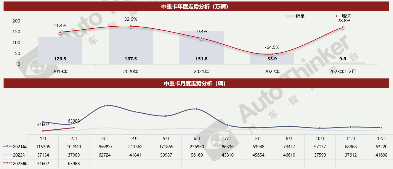 2023年1-2月,中重卡市场销售9.6万辆,同比增长28.8%。