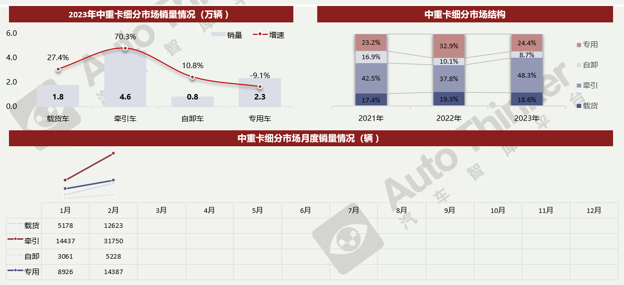 2023年1-2月,牵引车销量占据第一位,销量达到4.6万辆,同比增长70.3%。